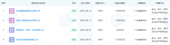 维科网锂电注意到,企查查显示,深圳易储能源科技有限公司(简称“深圳易储”)8月在深圳成立了四家全资子公司,分别为深圳合邦新能源有限公司、易能聚合(深圳)科技有限公司、深圳广储能源科技有限公司、深圳建源能源科技有限公司,注册资本在500万元至1.55亿元区间,所属行业均为电力、热力、燃气及水生产和供应业。